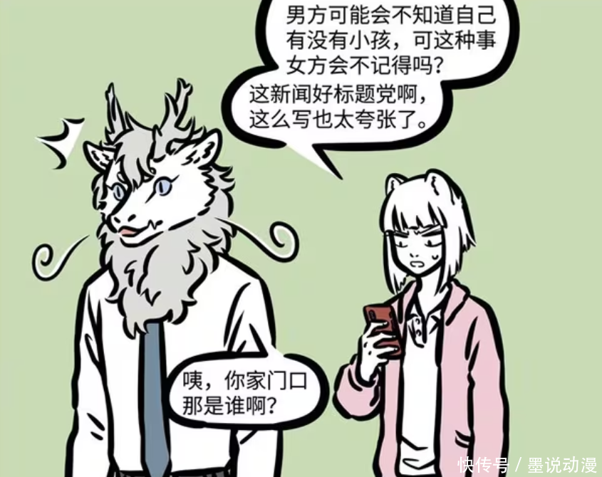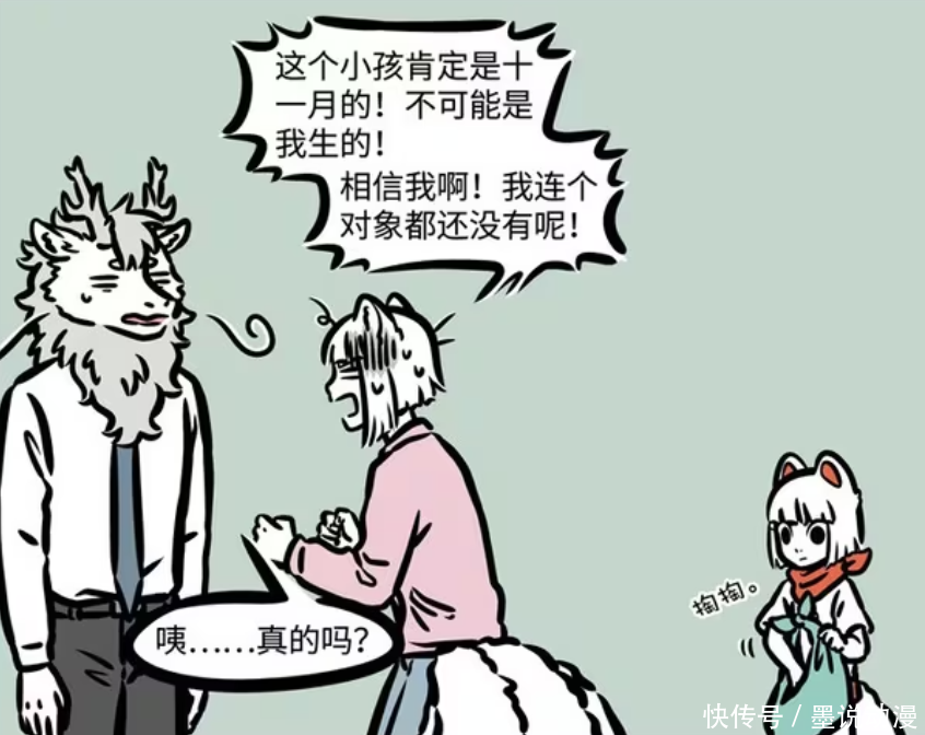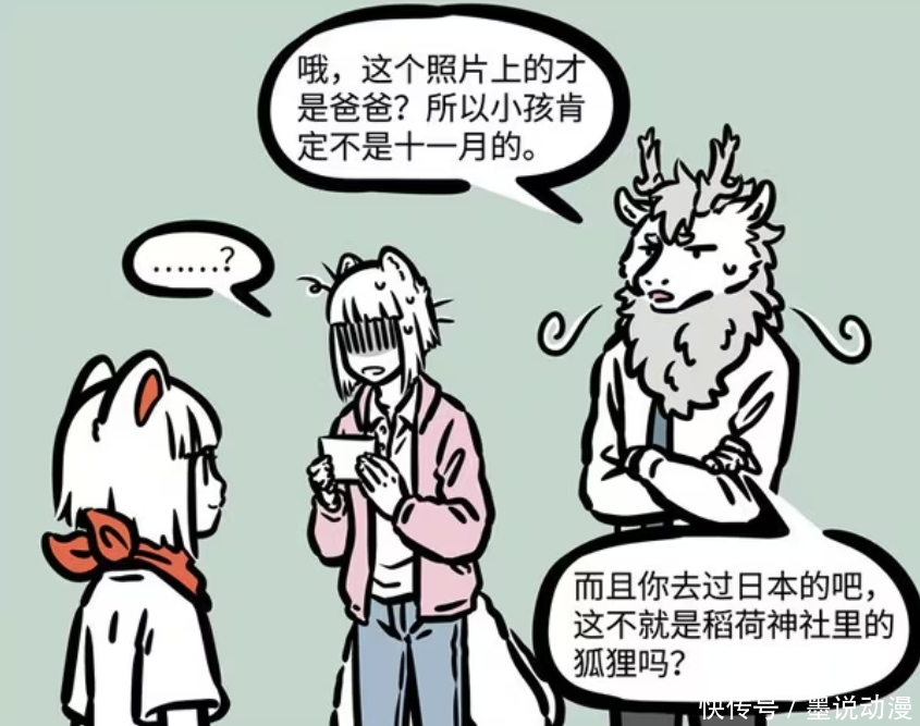 《非人哉》漫画版,九月真真切切当了一回妈妈。有个酷似九月的陌生小女孩出现,还把九月当成妈妈。九月一开始还极力辩解,后面这个小女孩拿出爸爸的照片,敖烈就更加怀疑。小女孩的爸爸是稻荷神社的狐狸,九月想知道帅不帅。