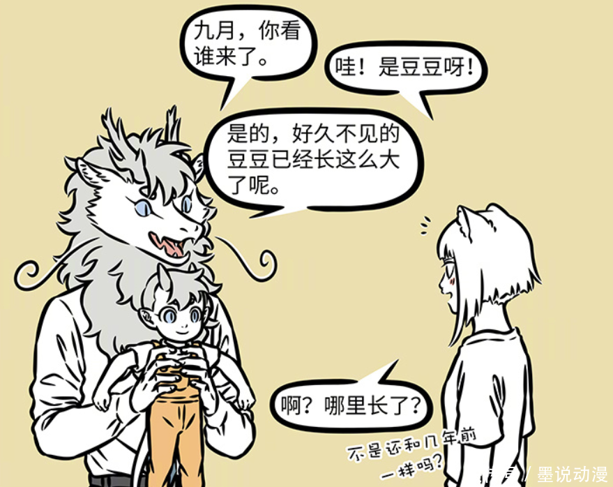 《非人哉》第1131话更新,敖烈带着豆豆出现,告诉九月豆豆长大了不少。可是九月根本就没发现,不管是人形态,还是兽形态,都跟以前一样。只是让人没想到,豆豆不仅是鳞片开始变成彩色,连性格都变化,现在的豆豆就是霸总人设,九月不想回忆起自己的黑历史。