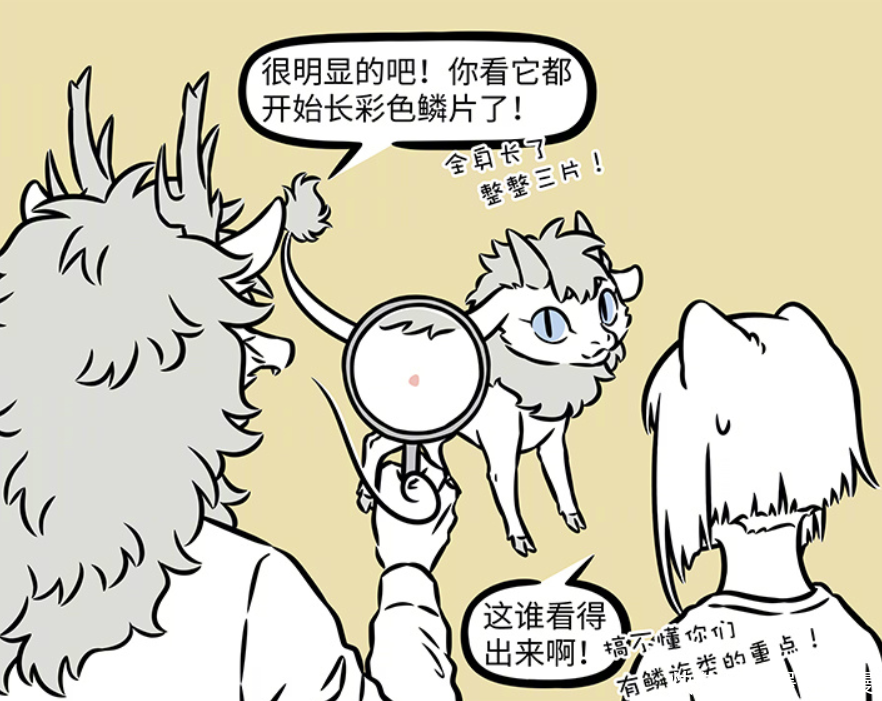 敖烈此时拿出放大镜,让九月仔细看看,表示变化还是很明显,他都开始长彩色鳞片。全身长出三片彩色鳞片,再过几百年,估计就变成跟麒麟舅舅一样。不过九月表示,这么细微的变化,怎么可能看得出来。九月搞不懂有鳞族类的重点,一般人也搞不懂。